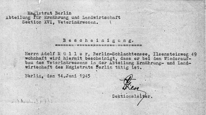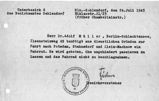 Berlin 1945 für alles braucht man eine Bescheinigung - hier, zur Führung eines (Dienst-)Fahrrades |