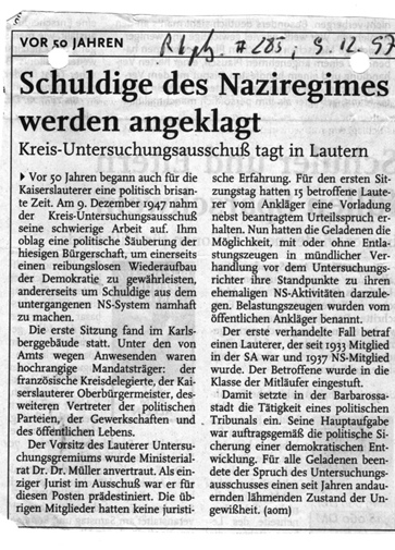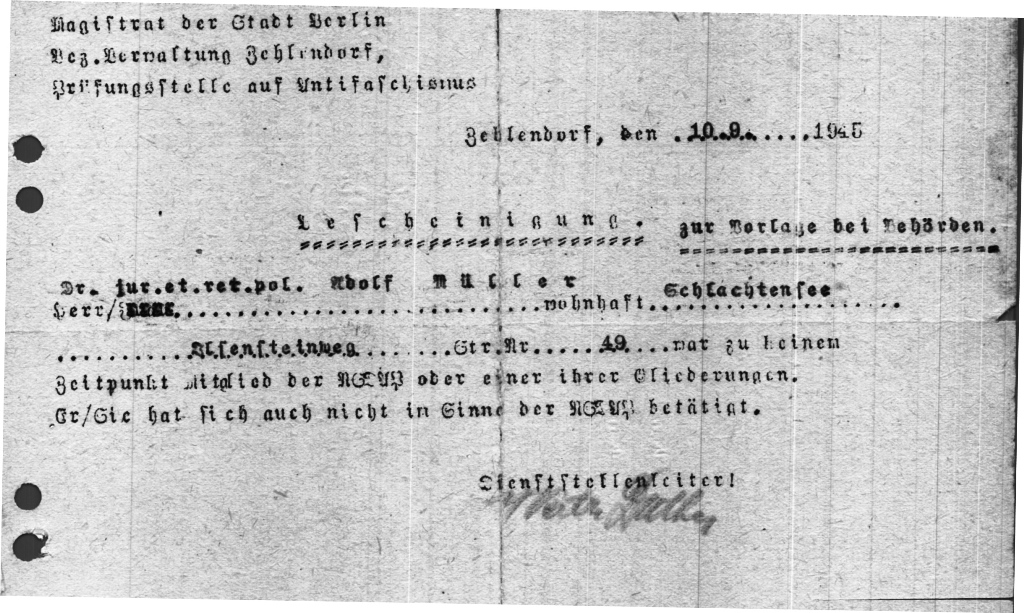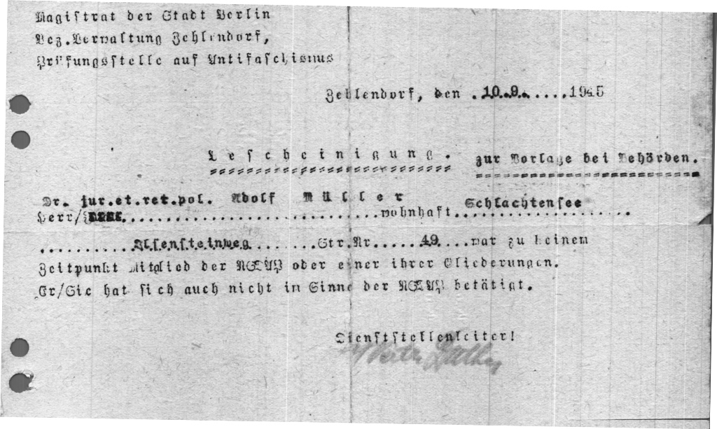 AM wurde , da er einer der wenigen unbelasteten Juristen darstellte, in den Zentralen Säuberungs-Ausschuß gewählt. Dort war er das einzigen Mitglied mit juristischer Ausbildung. | |