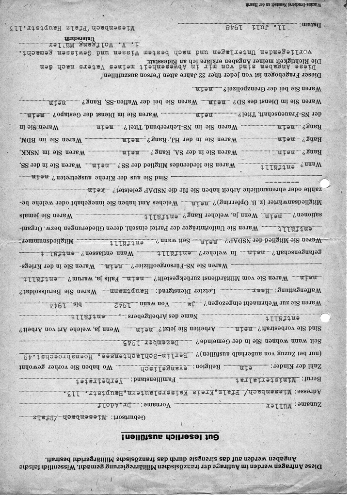 Fragebogen der französischen Besatzungs-Regierung zur Entnazifizierung | ||